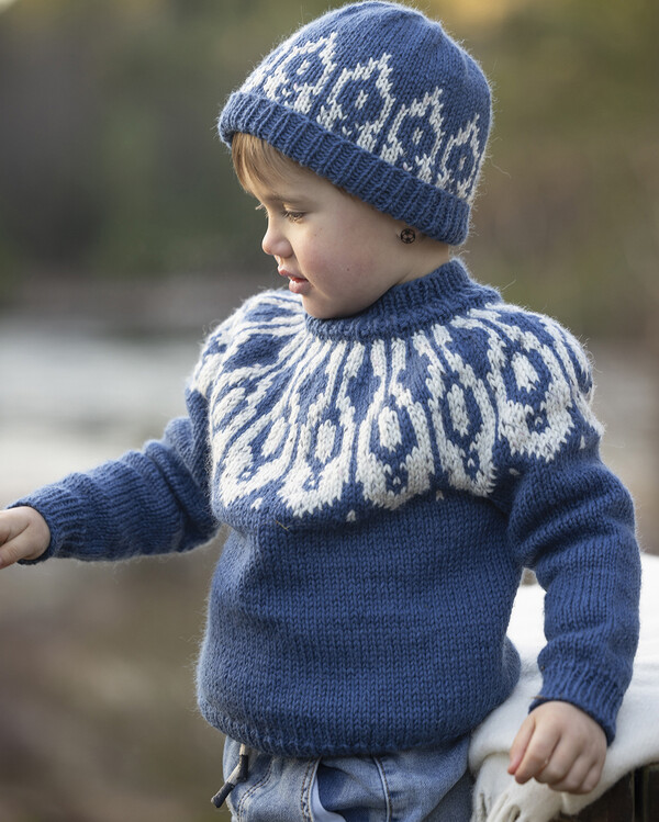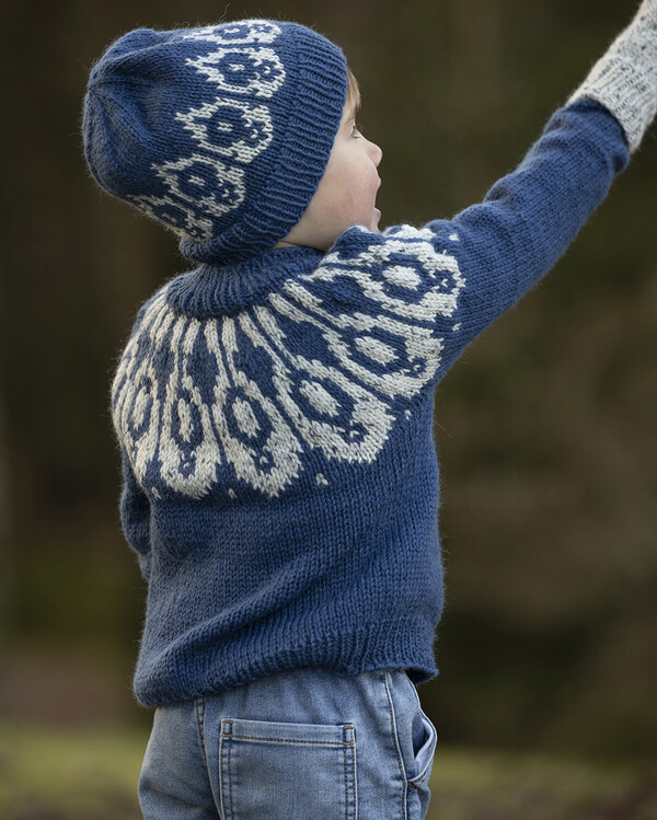 Detta stickmönster beskriver en klassisk barntröja med dekorativ mönsterstickning över oket. Tröjan har ett tidlöst uttr...