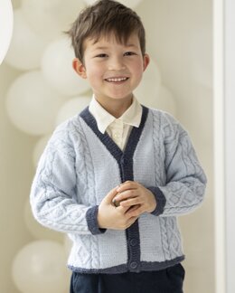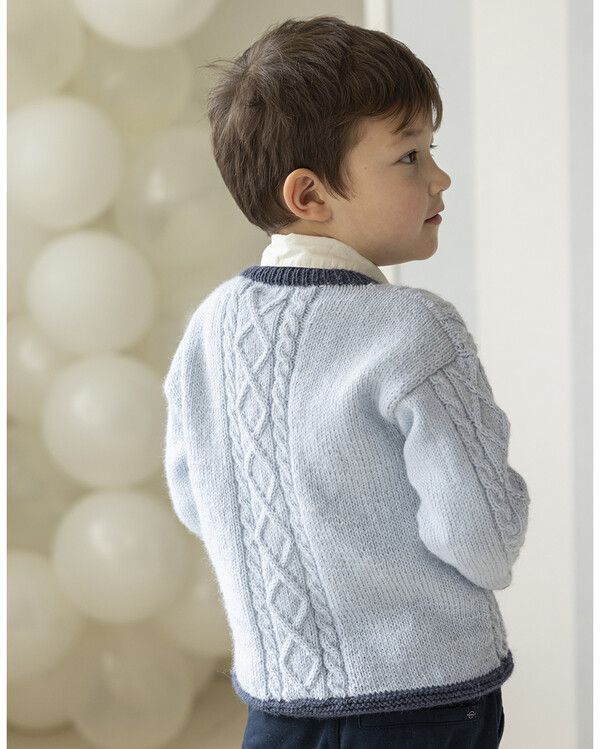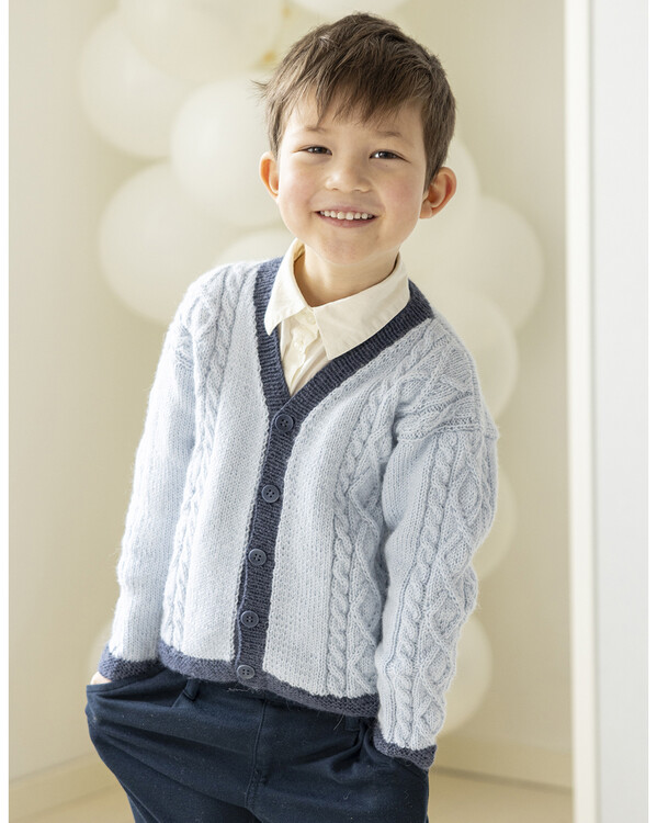 Ett klassiskt stickmönster på en barnkofta med vackra kabelstickade detaljer. Kontrastfärgade kanter ger en stilren och modern känsla.