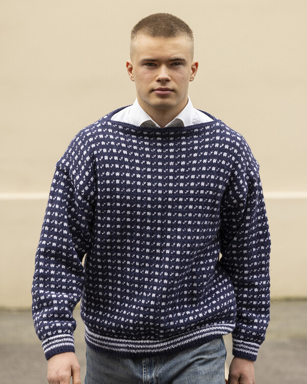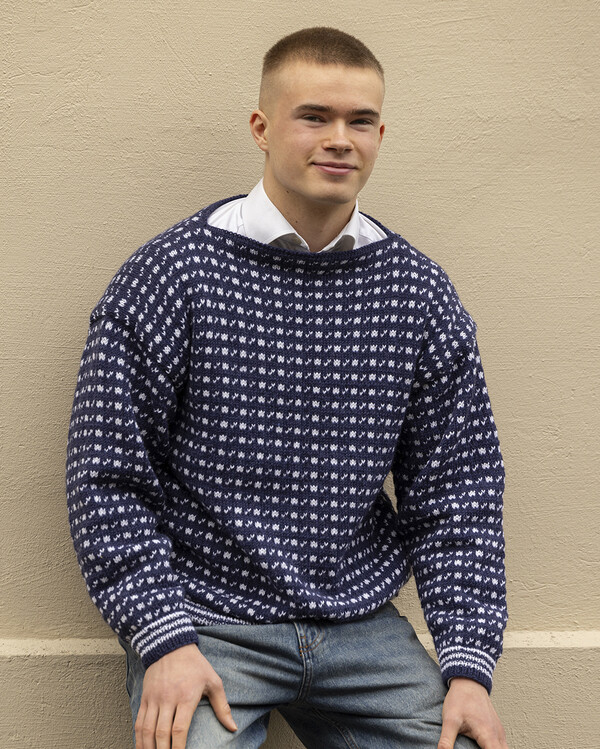 En stilren stickad tröja i klassisk marinblå färg med ett fint småmönster i kontrast som ger ett tidlöst och elegant uttryck.