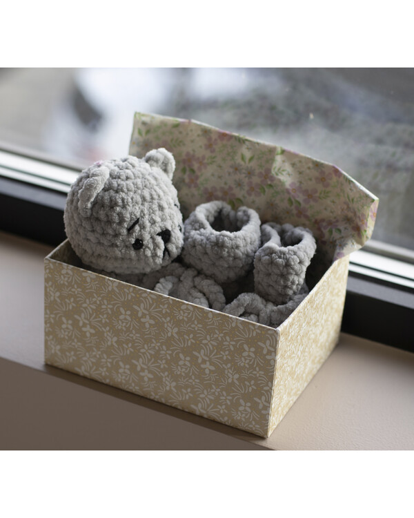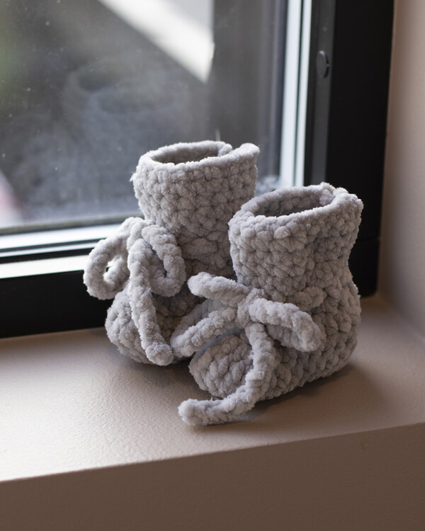 Mjuka och varma babytofflor som håller små fötter sköna året runt. De virkas enkelt och har snören som håller dem på plats – perfekta som gåva till nyfödda eller till dopet.