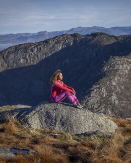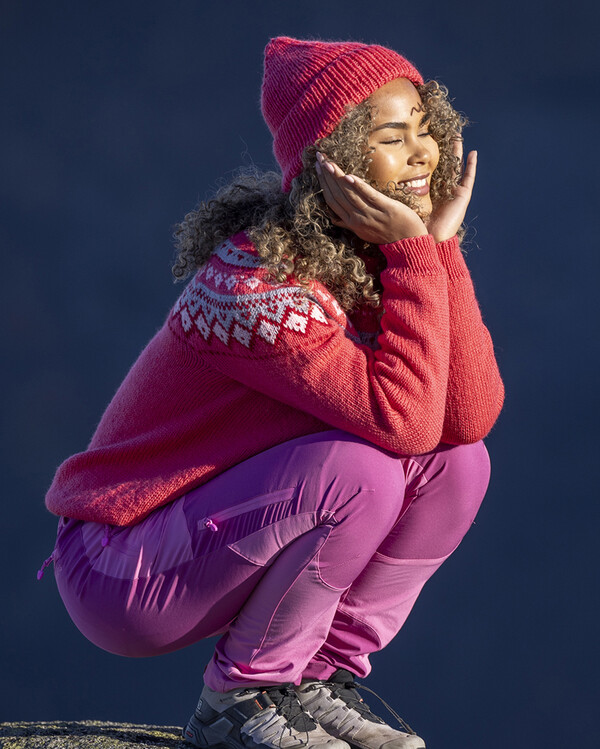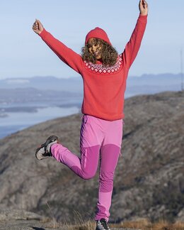 Sticka en modern och färgstark tröja med detta stickmönster. Det rundstickade oket i rosa och grå toner skapar ett lekfullt nordiskt uttryck, medan den mjuka passformen gör tröjan perfekt för både vardag och friluftsliv.
