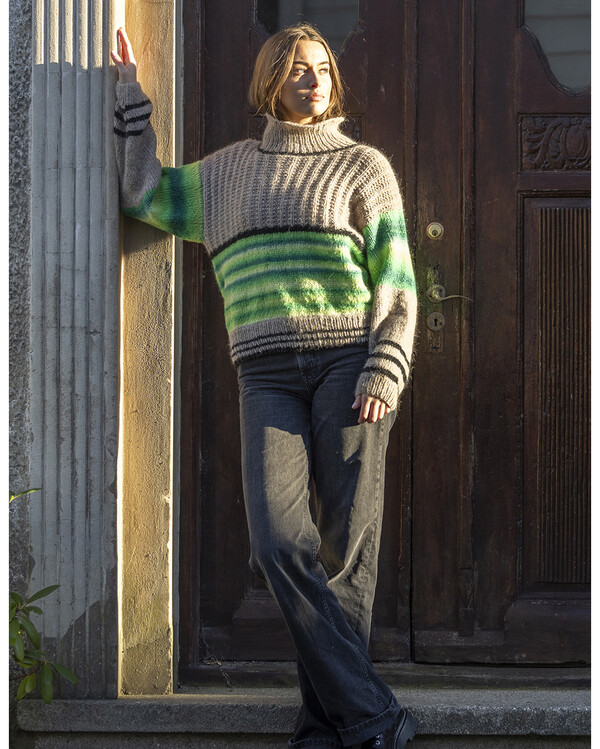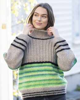 Sticka en modern tröja med breda ränder och hög polokrage. Den avslappnade passformen och de grafiska färgskiftningarna ...