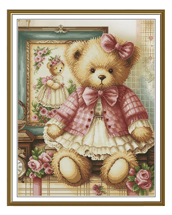 Ett ljuvligt korsstygnsbroderi med en klassisk nallebjörn klädd i rosa klänning och rosett.\nDe mjuka färgerna och de ro...