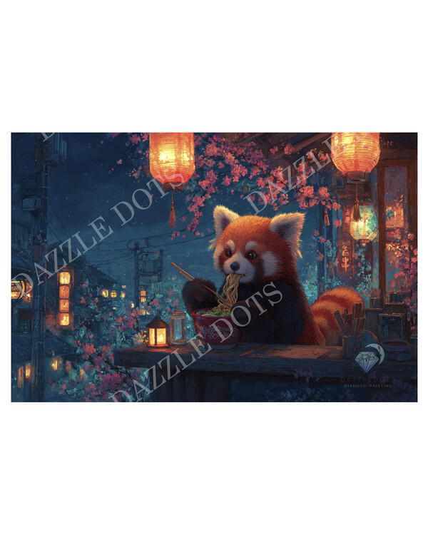 En charmig röd panda sitter bland blommande körsbärsgrenar och lysande lyktor. Ett färgstarkt och detaljrikt diamond pai...