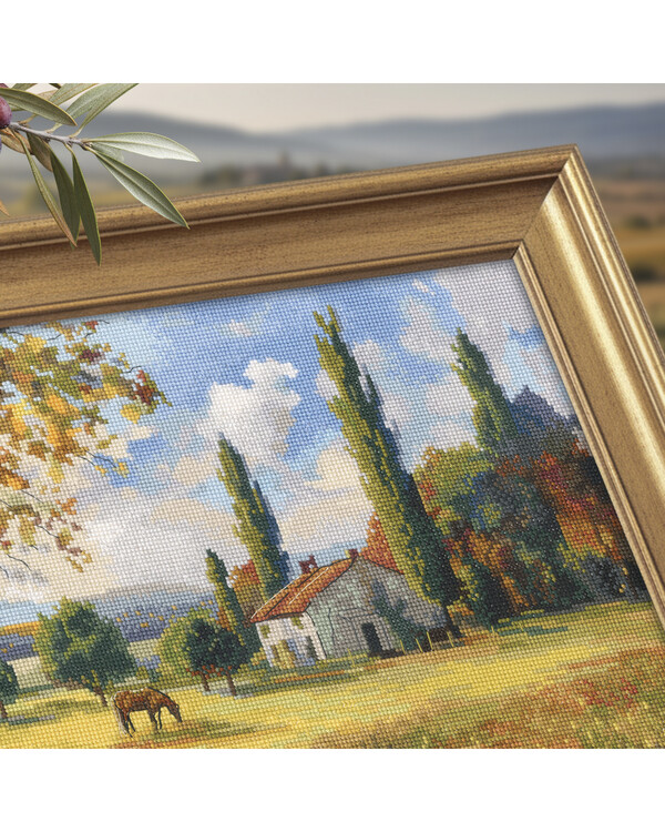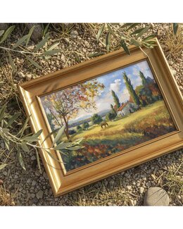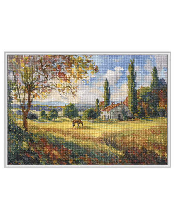 Ett varmt och färgrikt broderimotiv med ett lantligt landskap i höstens toner. Den gyllene ängen, träden och huset skapa...