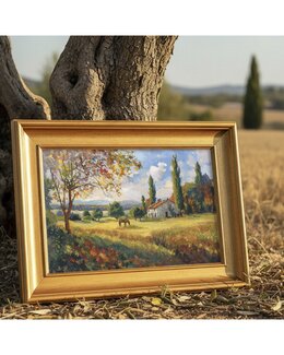 Den gyllene ängen, träden och huset skapar en inbjudande och idyllisk scen.