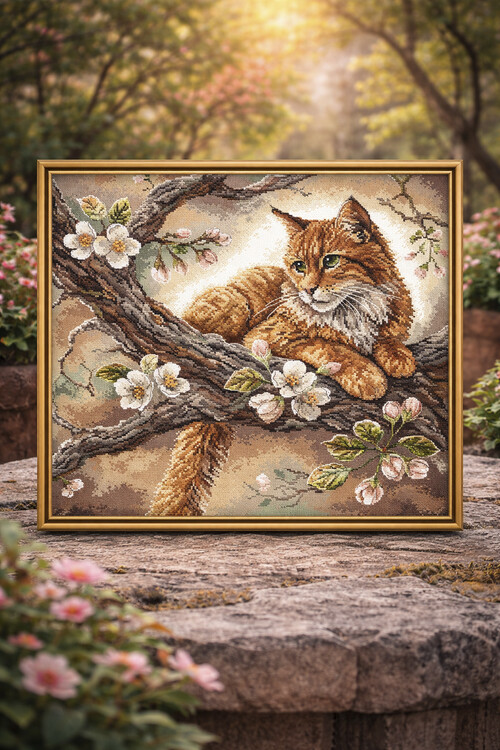 Ett harmoniskt och detaljrikt motiv med en vilande katt på en gren i ett blommande äppelträd. De mjuka färgtonerna och de vackra blomsterdetaljerna skapar ett lugnt och tidlöst uttryck som passar i alla hem.