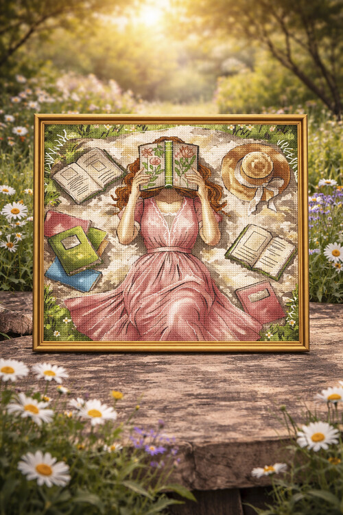 Ett varmt och charmigt motiv av en person som försjunker i böckernas värld, omgiven av böcker och natur. De mjuka färger...