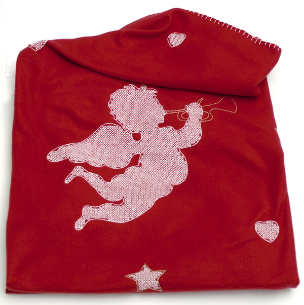 Broderas med mouline- och metallicgarn i kors- och efterstygn samt langettsöm på röd fleece av 100% polyester, där motivet är ritat. Storlek ca 90x110 cm.
