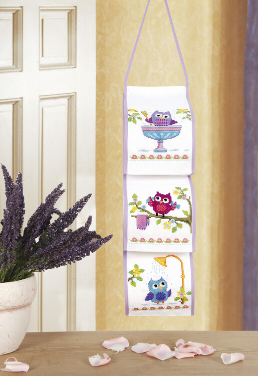 Broderas med moulinégarn i räknade kors- och efterstygn på vit aidaväv, 7 rutor/cm. Toarullehållaren är färdigkonfektion...