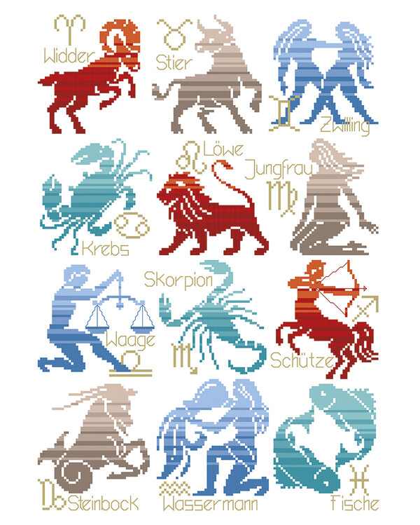 De tydliga siluetterna och de klassiska färgkombinationerna framhäver varje stjärnteckens unika symbol, vilket gör detta mönster idealiskt både för astrologiintresserade och för dig som vill brodera en personlig gåva.