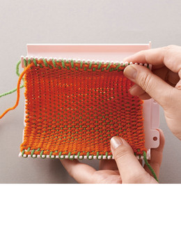 Vävram i plast inklusive skyttel bl.a. Max vävbredd 12x29 cm. Storlek 12,5x29 cm. Inklusive instruktioner på engelska.